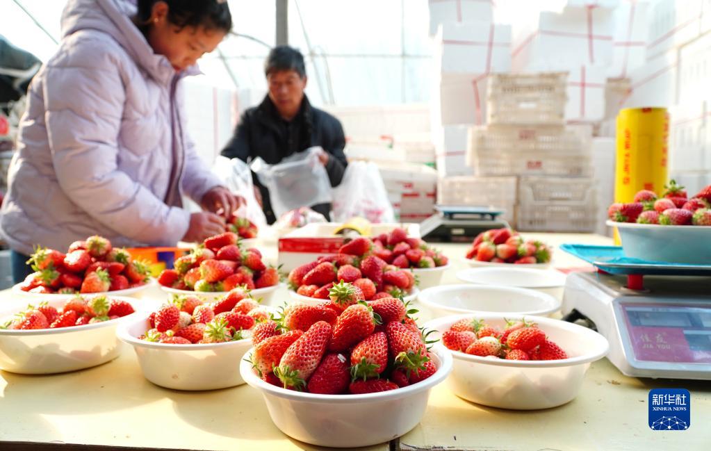 2月16日,在山東省東平縣無鹽村,村民將采摘的草莓進行稱重。