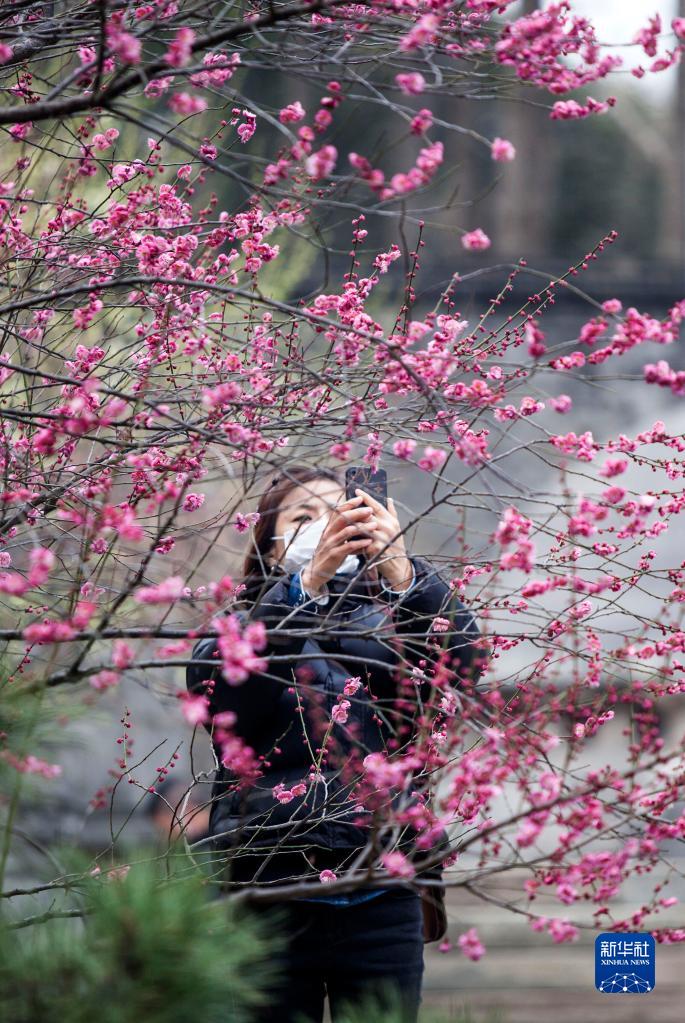 2月16日,游人在南京莫愁湖公園里拍攝梅花。