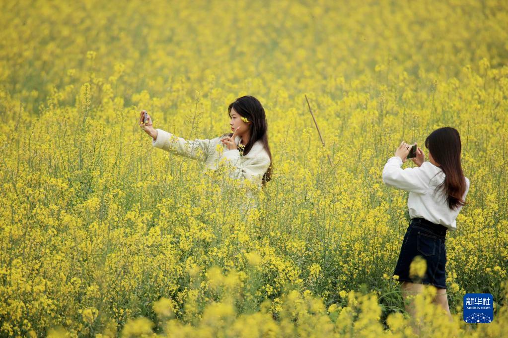 2月16日,游客在廣西柳州市融安縣浮石鎮(zhèn)橋頭村油菜花海中游玩。