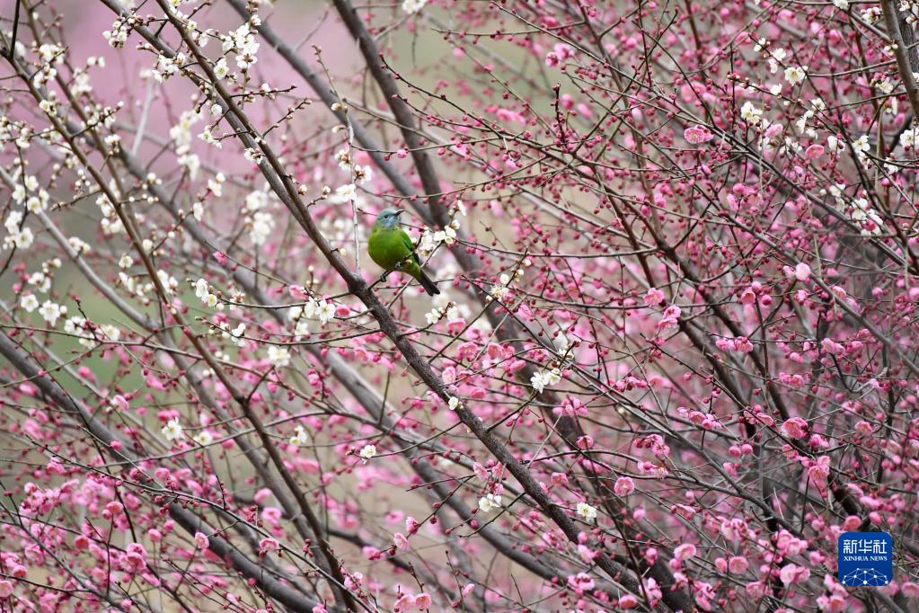 2月16日,在貴州省仁懷市楠竹林公園,一只小鳥在梅花枝頭停歇。