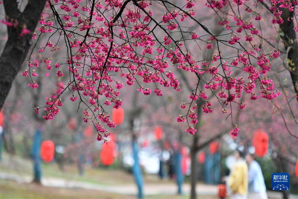 2月16日,游客在湖南省郴州市桂陽縣櫻花園賞花。