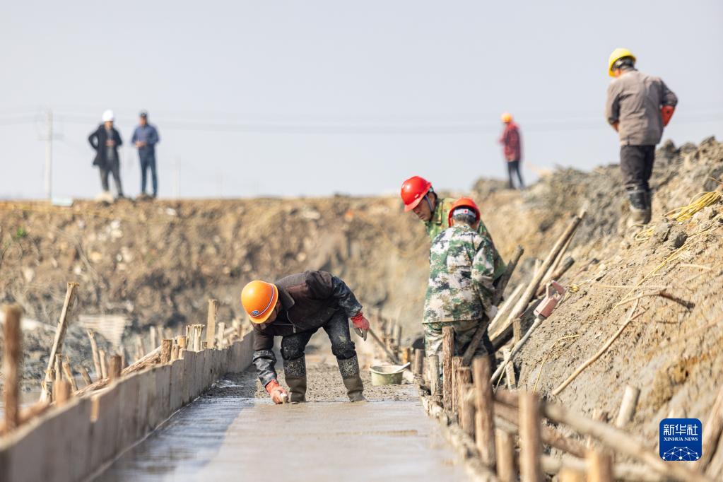 2月16日,工人在浙江省湖州市長興縣虹星橋鎮修建水渠。