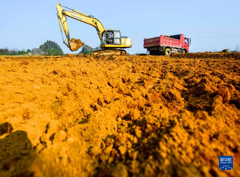 2月16日,在湖南省永州市道縣壽雁鎮芽洞村,工人駕駛挖掘機在高標準農田建設項目現場施工。