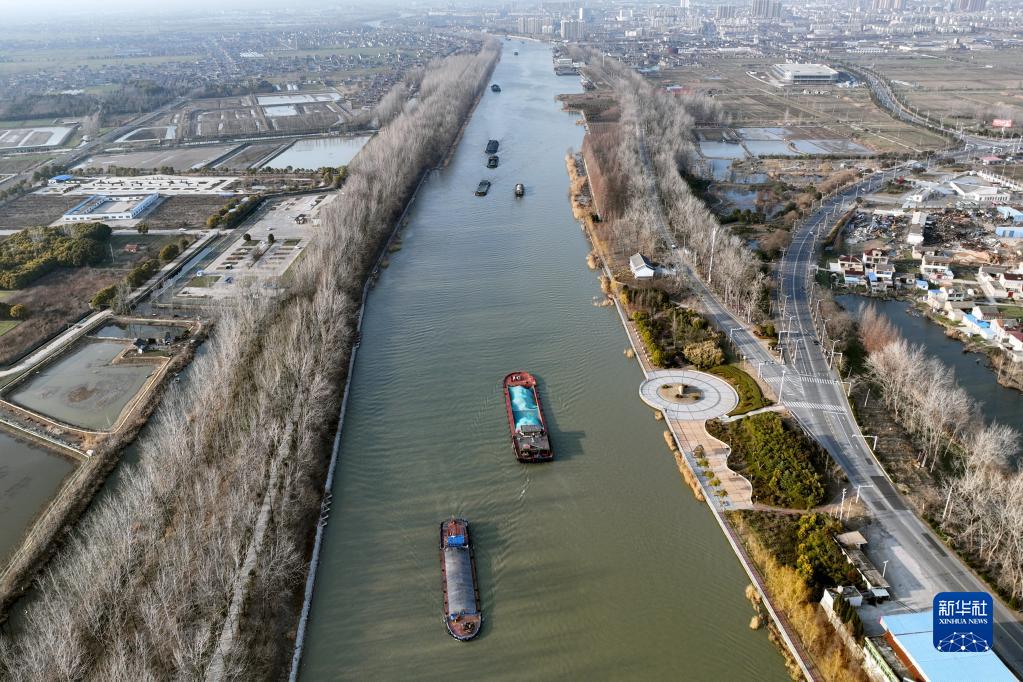 2月16日,貨船行駛在京杭大運河江蘇寶應段(無人機照片)。