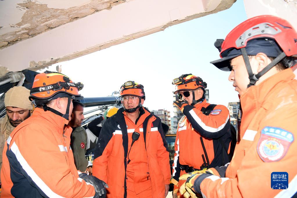 2月9日,中國救援隊隊員在土耳其哈塔伊省安塔基亞市開展救援工作。