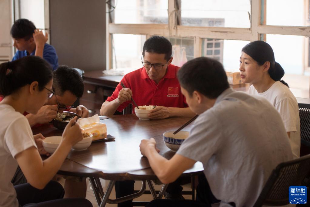 2月14日,在中非共和國首都班吉,第19批援中非中國醫(yī)療隊(duì)成員在駐地吃午飯。