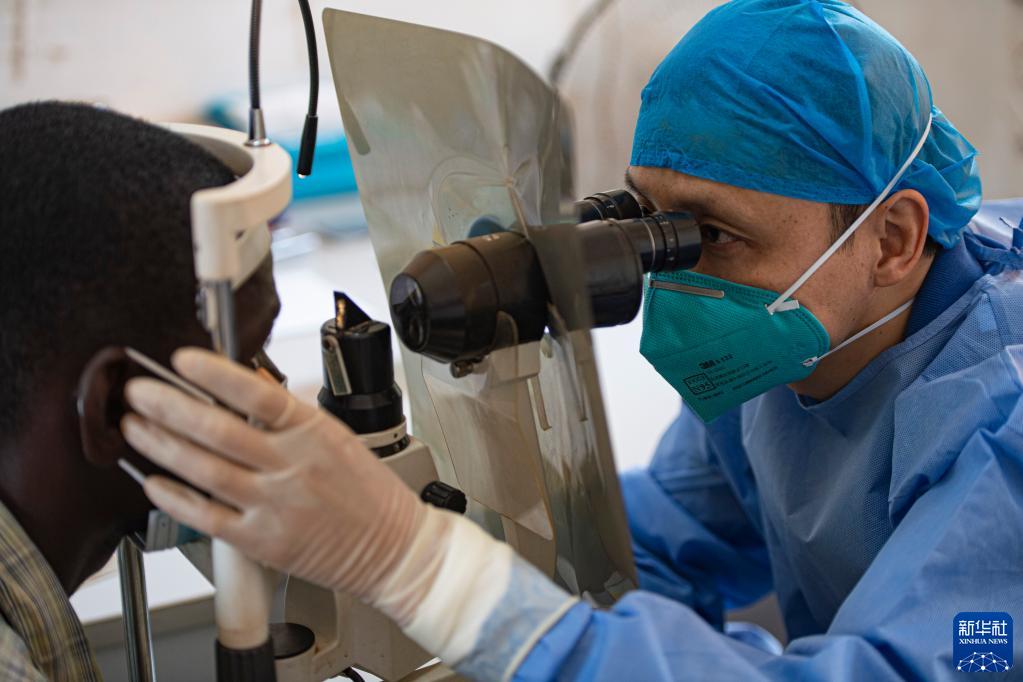 2月13日,在中非共和國(guó)首都班吉友誼醫(yī)院,第19批援中非中國(guó)醫(yī)療隊(duì)眼科醫(yī)生章友美為患者做檢查。