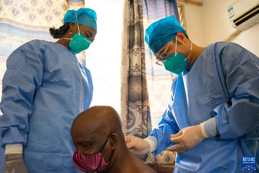 2月13日,在中非共和國(guó)首都班吉友誼醫(yī)院,第19批援中非中國(guó)醫(yī)療隊(duì)針灸科醫(yī)生郝亞波(右)為病人進(jìn)行針灸治療。