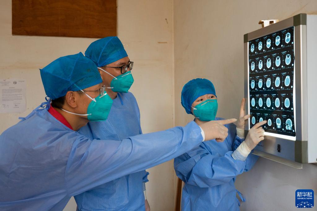 2月14日,在中非共和國首都班吉友誼醫(yī)院,第19批援中非中國醫(yī)療隊隊長、神經(jīng)內(nèi)科醫(yī)生王寶祥(左)與外科醫(yī)生徐言(中)、放射科醫(yī)生王佳開展多學科會診。