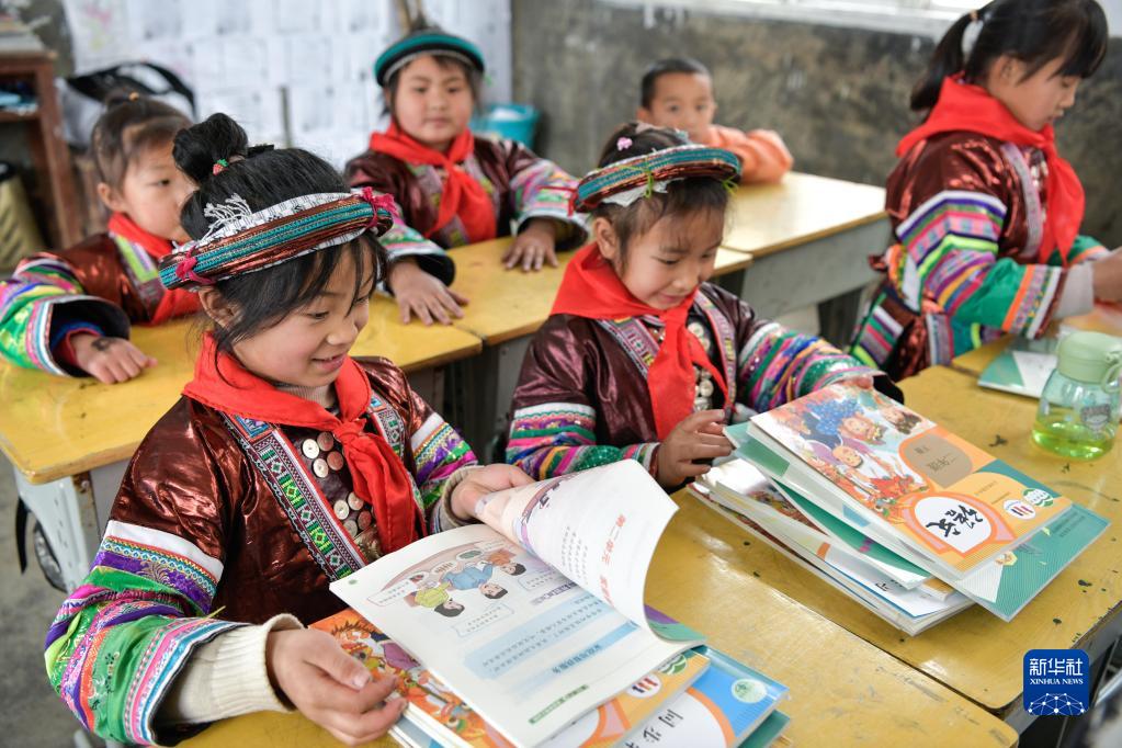 2月16日,貴州省從江縣西山鎮中寨教學點學生領到新書。