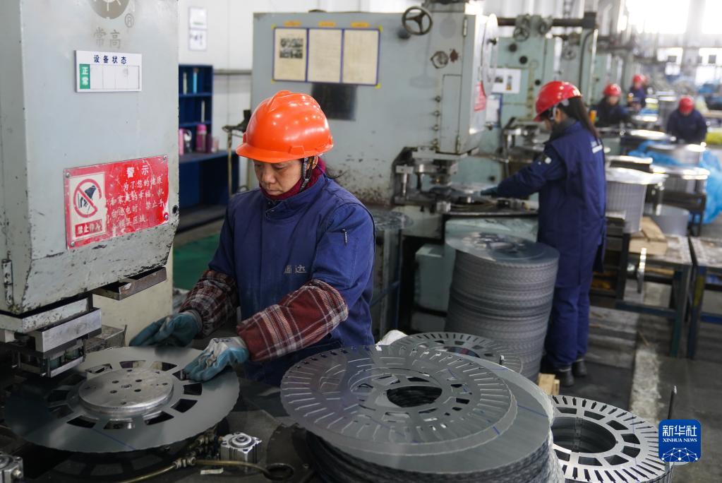 2月16日,工人在位于興仁鎮的南通通達矽鋼沖壓科技有限公司生產車間忙碌。