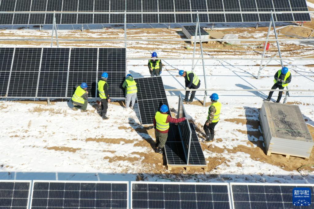 2月16日,在古浪縣黃花灘一處光伏發電項目建設現場,工人安裝光伏組件(無人機照片)。
