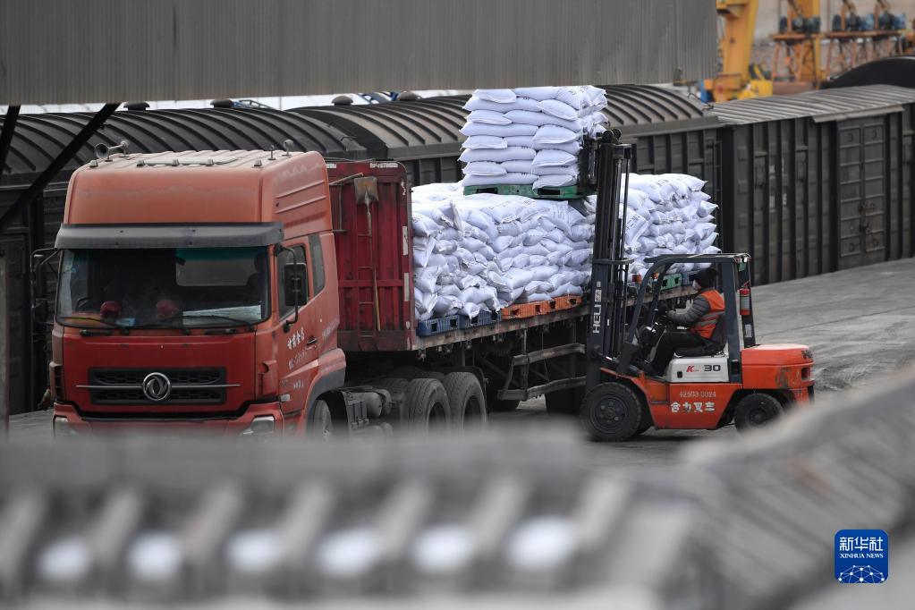 2月17日,工作人員在蘭州貨運中心金昌鐵路貨場內進行化肥裝車作業。