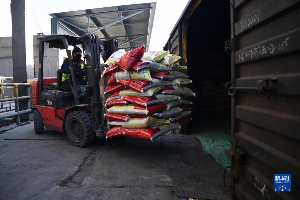 2月17日,在甘肅省金昌市一企業(yè)鐵路專用線上,工作人員駕駛叉車將化肥裝車。