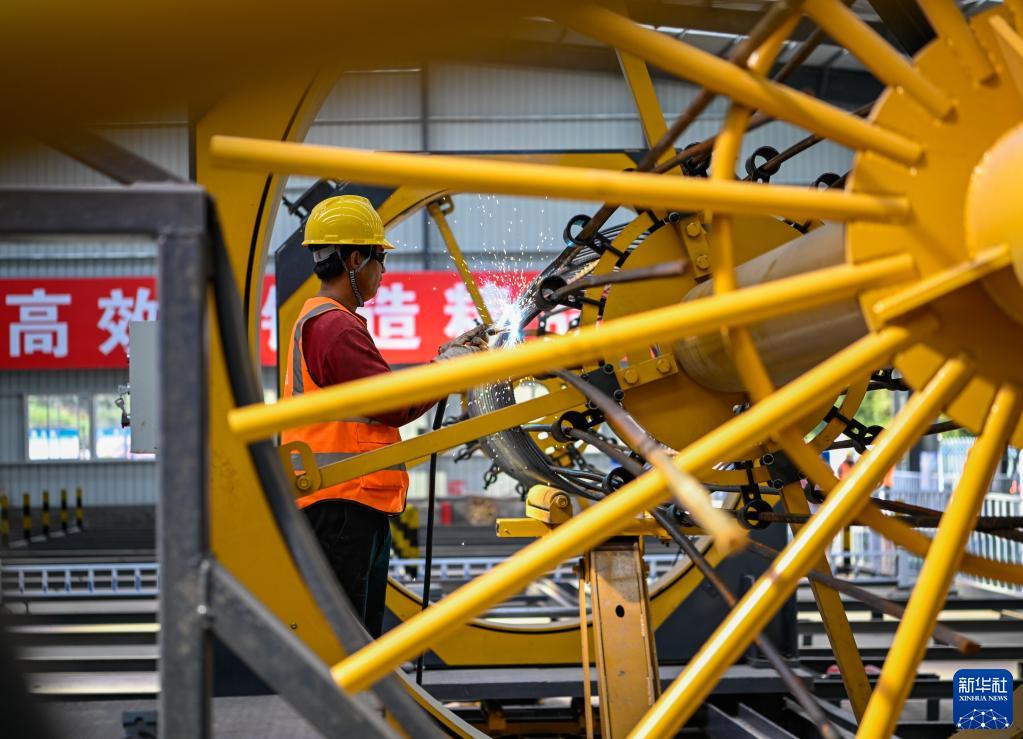2月17日,在位于達(dá)州市境內(nèi)的中鐵四局西渝高鐵鋼筋加工廠,工人在焊接鋼筋籠。