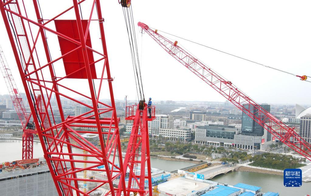 2月17日,在位于中國(上海)自由貿易試驗區臨港新片區的中建二局臨港西島中銀金融中心項目工地,一名智能造樓機動力臂駕駛員在進行鋼纜安全例行檢查(無人機照片)。