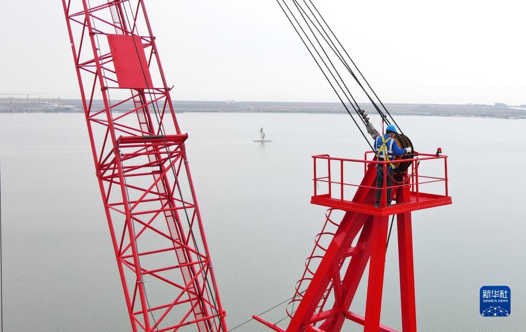 2月17日,在位于中國(上海)自由貿易試驗區臨港新片區的中建二局臨港西島中銀金融中心項目工地,一名智能造樓機動力臂駕駛員在進行鋼纜安全例行檢查(無人機照片)。