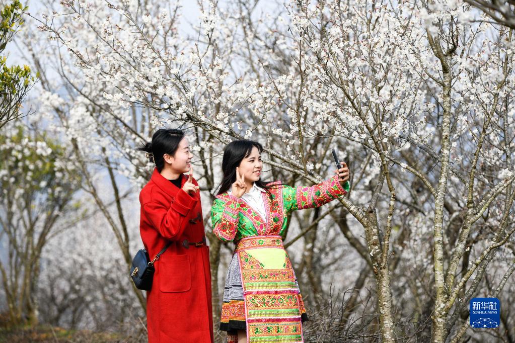 2月17日,在貴州省黔西南布依族苗族自治州安龍縣普坪鎮一處櫻桃基地,游人在盛開的櫻桃花下自拍。