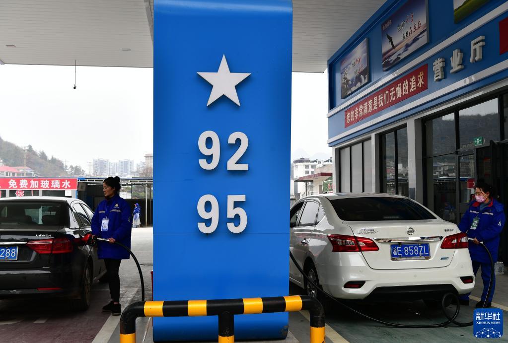 2月17日,湖南省邵陽(yáng)市城步苗族自治縣一加油站的工作人員給汽車(chē)加油。