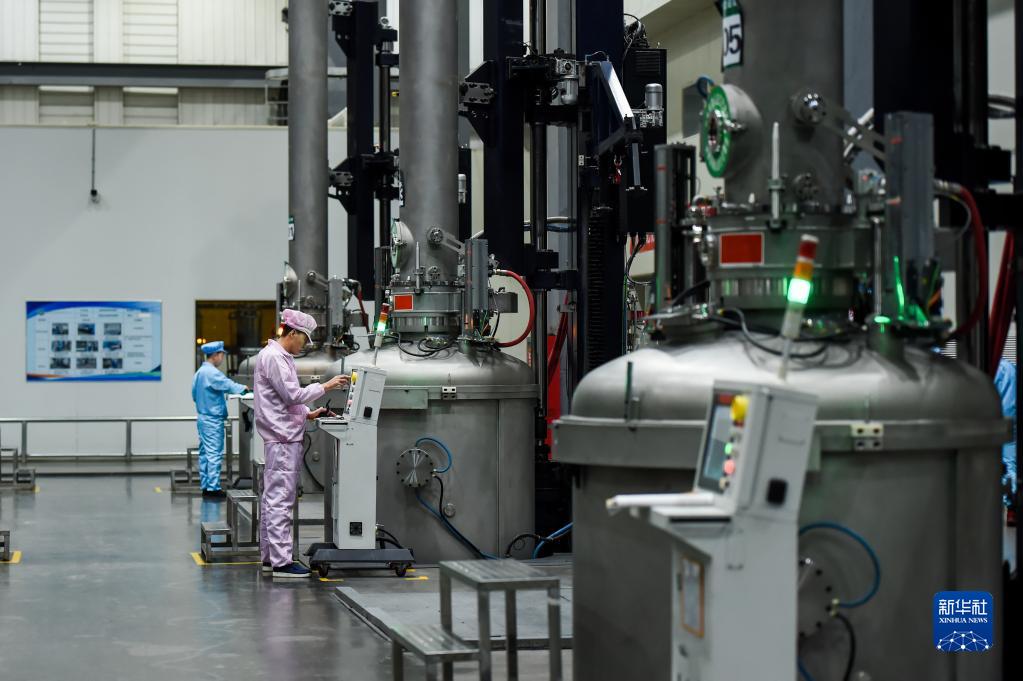 2月17日,在烏海市京運通新材料科技有限公司,工人在生產(chǎn)車間作業(yè)。