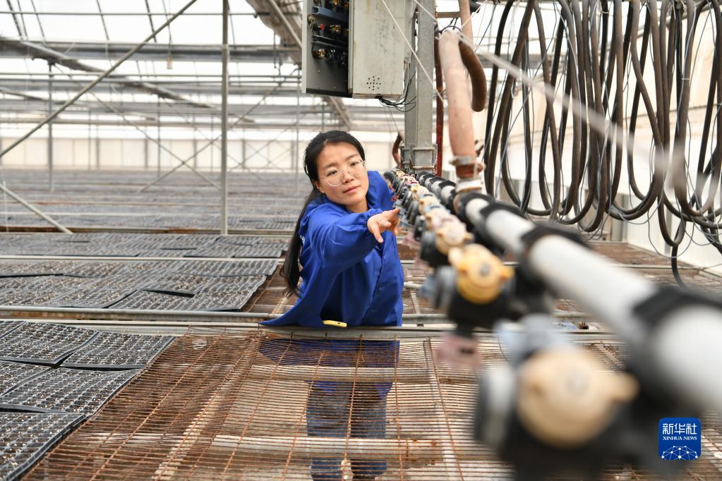 2月17日,張莎莎在連棟育苗溫室內(nèi)查看噴灌設(shè)施。