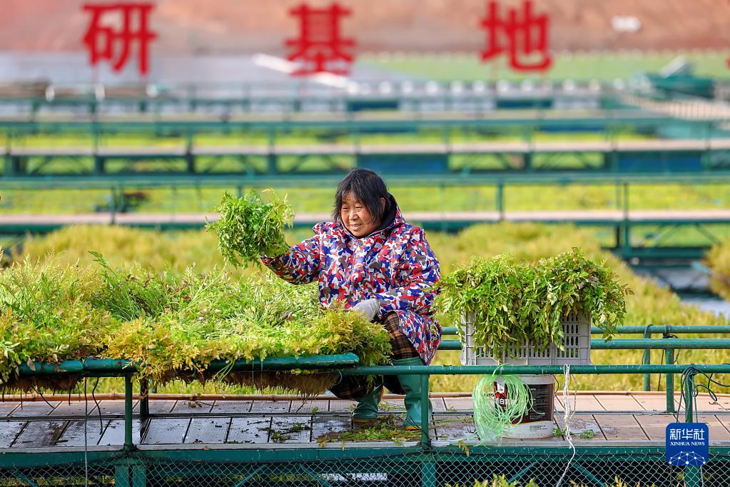 2月17日,浙江省杭州市淳安縣千島湖鎮坪山生態浮島上,工作人員忙著采摘水生蔬菜。