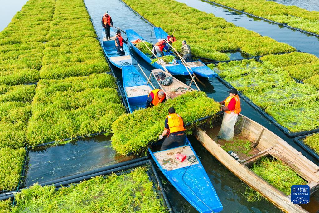 近年來,浙江省杭州市淳安縣在千島湖典型庫灣、入湖口等區(qū)域,積極運用生態(tài)浮島水上植物無土栽培技術(shù)種植空心菜、水芹菜等水生蔬菜,直接吸收庫區(qū)水體中氮磷等元素,從而能夠有效地降低水體中營養(yǎng)物質(zhì)的含量,提升水質(zhì)。近日,水生蔬菜進入采收季節(jié),“湖上菜園”呈現(xiàn)春收繁忙景象。