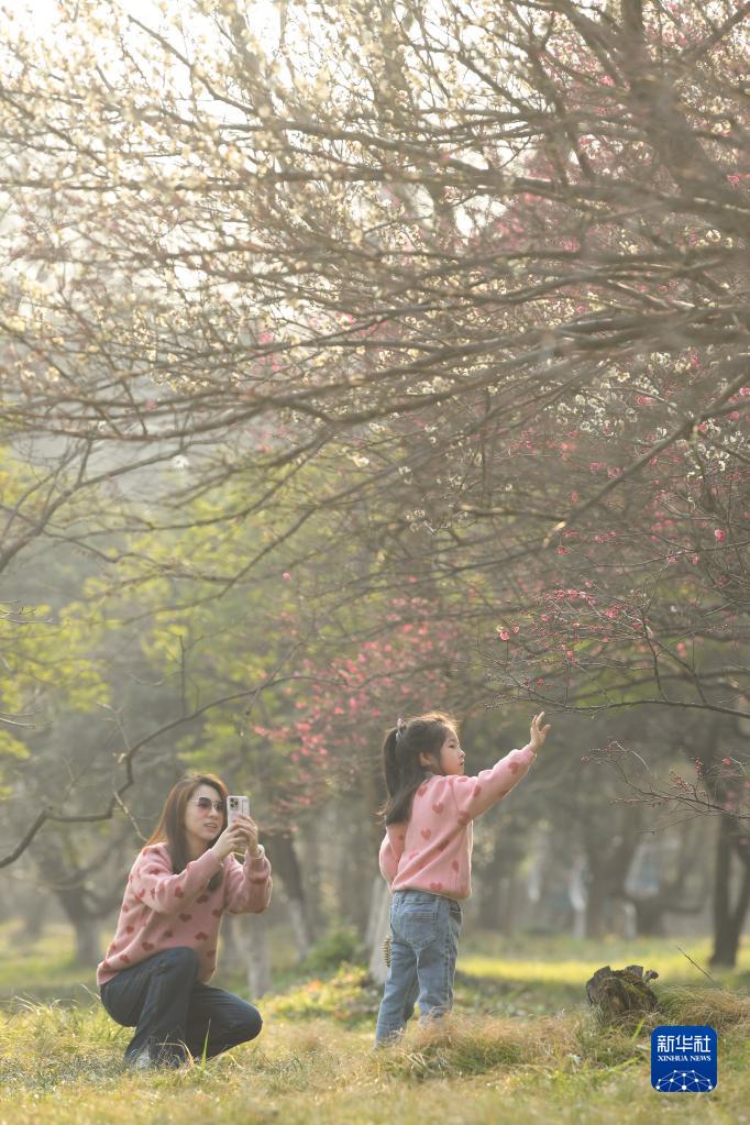 2月18日,一對母女在西溪濕地拍照賞梅。