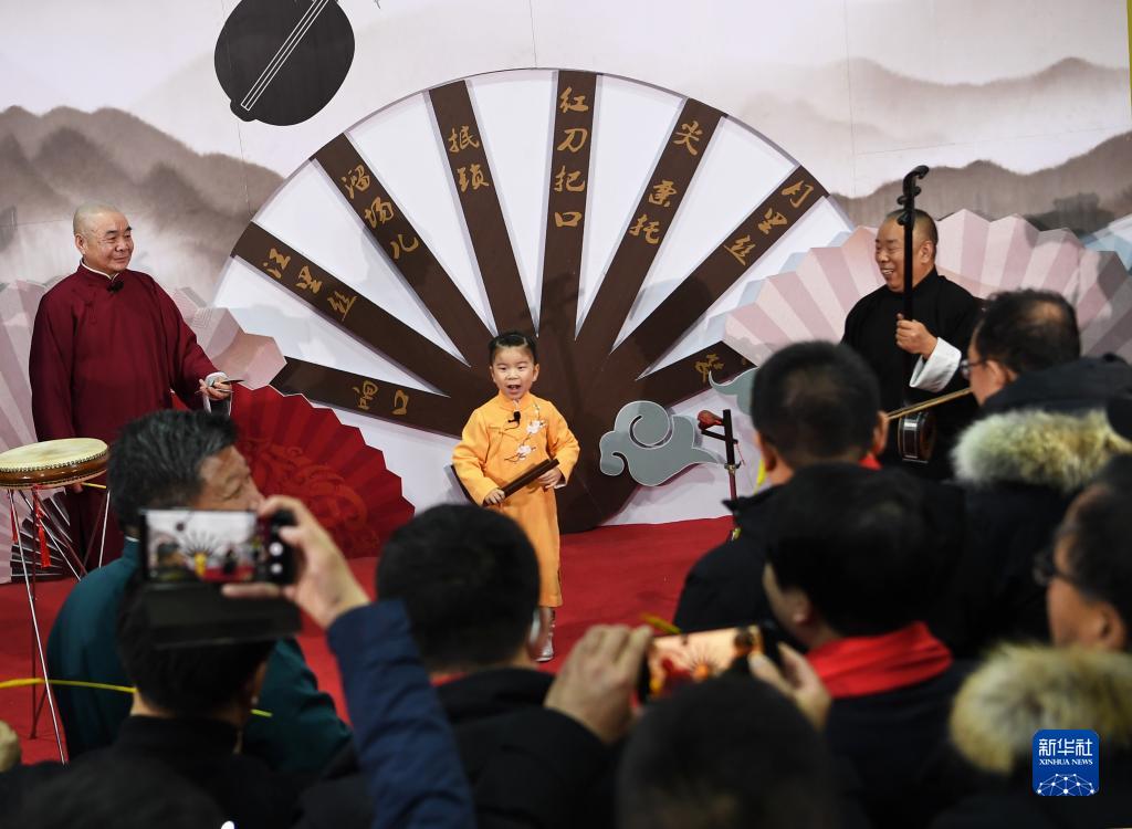 游客在榆林老街的非遺展館內觀看南陽三弦書表演(2月17日攝)。