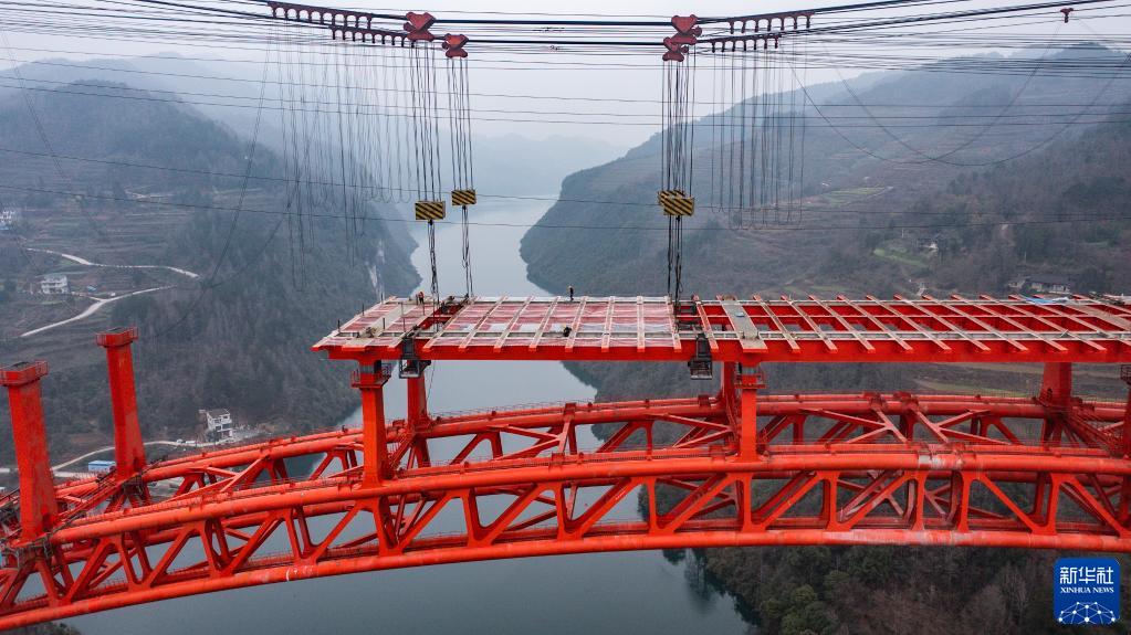 正在進行橋面系施工的德余高速烏江特大橋(2月17日攝,無人機照片)。