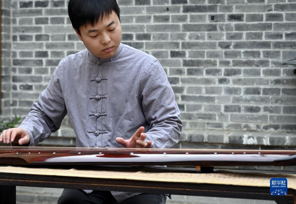 在蘭考縣堌陽鎮徐場村墨武琴坊里,斫琴師徐亞沖在彈奏古琴(2月16日攝)。