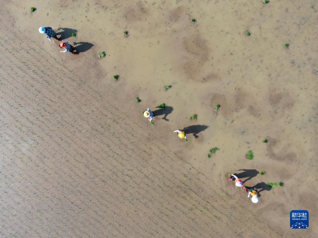 2月18日,農民在云南省勐海縣黎明農場田間種植早稻(無人機照片)。
