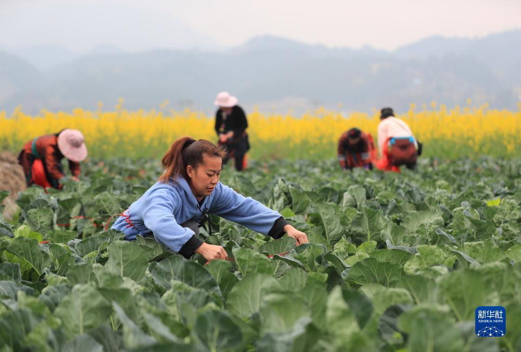2月18日,村民在貴州省黔東南苗族侗族自治州從江縣貫洞鎮貫洞村田間管護蔬菜。
