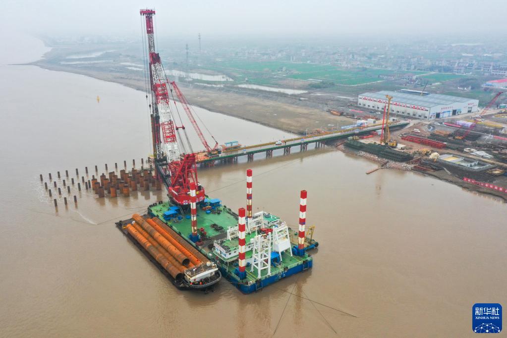 這是2月18日拍攝的崇啟公鐵長江大橋永久鋼護筒施打作業現場(無人機照片)。