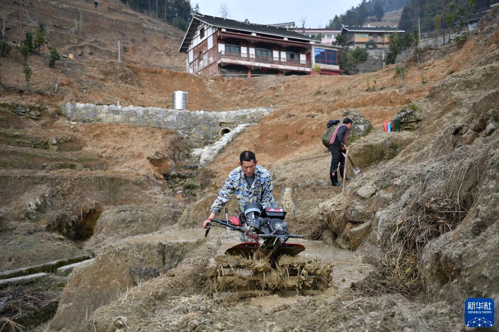 2月18日,村民在紫鵲界梯田駕駛拖拉機翻耕梯面。