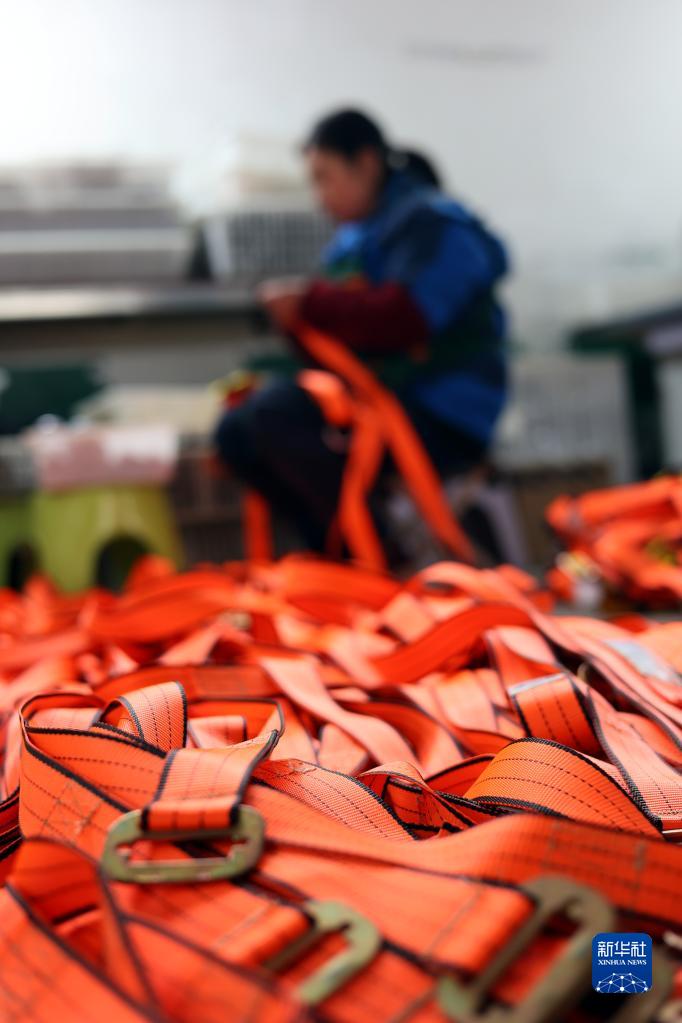 2月18日,山東省濱州市惠民縣姜樓鎮(zhèn)一家繩網(wǎng)企業(yè)工人在趕制一批來自國外的安全帶訂單。