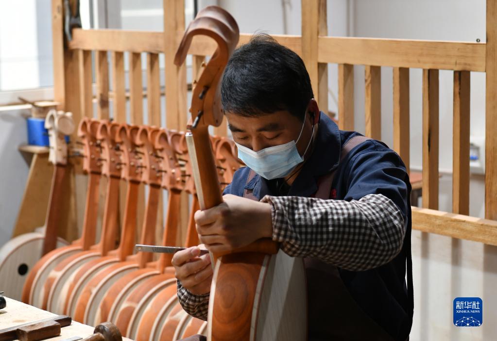 2月18日,河北省肅寧縣一家民族樂器生產企業的工人在生產車間內制作樂器。