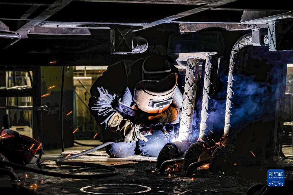 工人在位于遼寧省沈陽市的北方重工有限公司車間焊接零部件(1月13日攝)。