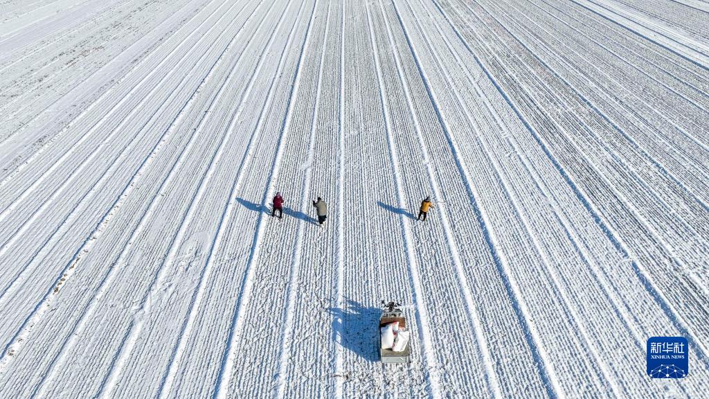 2月19日,河北省遵化市東新莊鎮農民在為麥田施肥(無人機照片)。