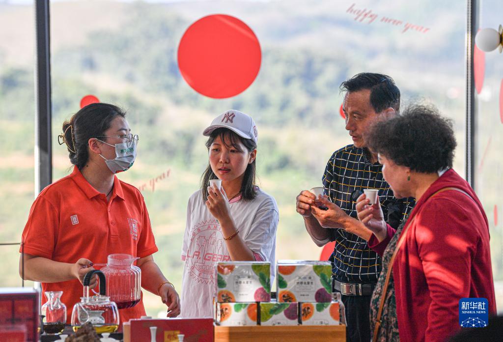 2月18日,游客在位于海南省儋州市的嘉禾共享農(nóng)莊品嘗工作人員(左一)沖泡的熱帶茶品。