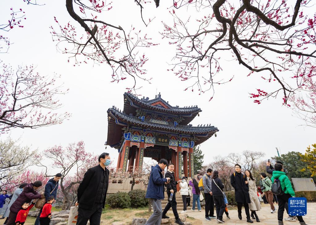 2月18日,游客在江蘇南京梅花山賞花。