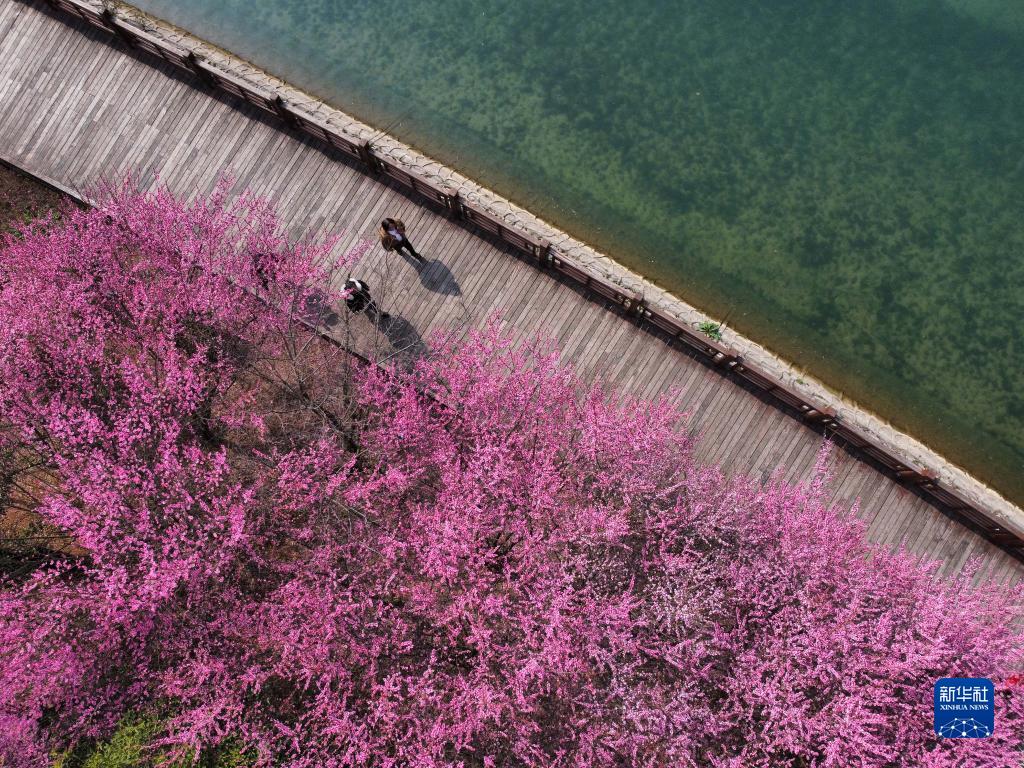 2月19日,居民在貴州省施秉縣河濱公園賞花漫步(無人機照片)。