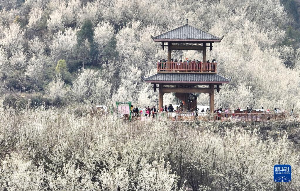 2月18日,游客在廣西柳州市鹿寨縣導江鄉山楂林中賞花休閑(無人機照片)。