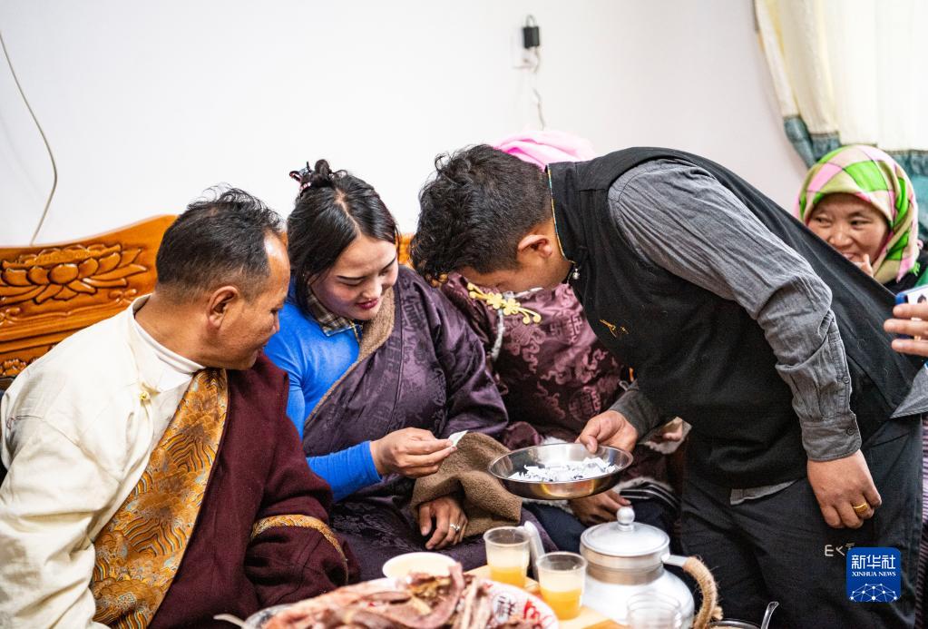 來自世界海拔最高縣——那曲市雙湖縣的搬遷群眾石秀次仁一家,在位于雅魯藏布江畔的山南市貢嘎縣森布日安置點迎來了搬家后的第一個“古突”夜。一家人按照傳統習俗吃“古突”,祈求來年平安幸福。用餐間隙,孩子們從托盤里隨機拿取一張小紙條展示給家人。這些提前準備好的小紙條上畫著各種圖案,也各具寓意,比如辣椒寓意嘴硬心軟,麥粒寓意有福等。