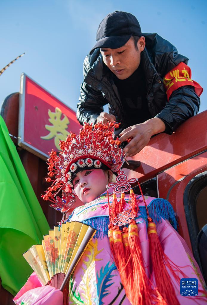 2月19日,西安市臨潼區櫟陽街道卷子村村民為即將上陣表演“背芯子”的小朋友整理裝束造型。