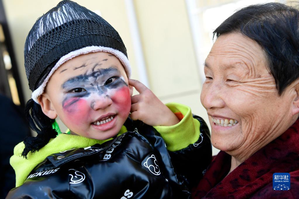 2月19日,西安市臨潼區櫟陽街道卷子村參加“背芯子”表演的小朋友向奶奶展示自己的妝扮。