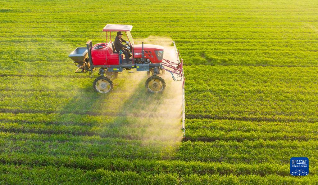 2月19日,在江蘇省海安市隆政街道林橋村,村民駕駛植保機械在小麥田間噴灑藥物(無人機照片)。