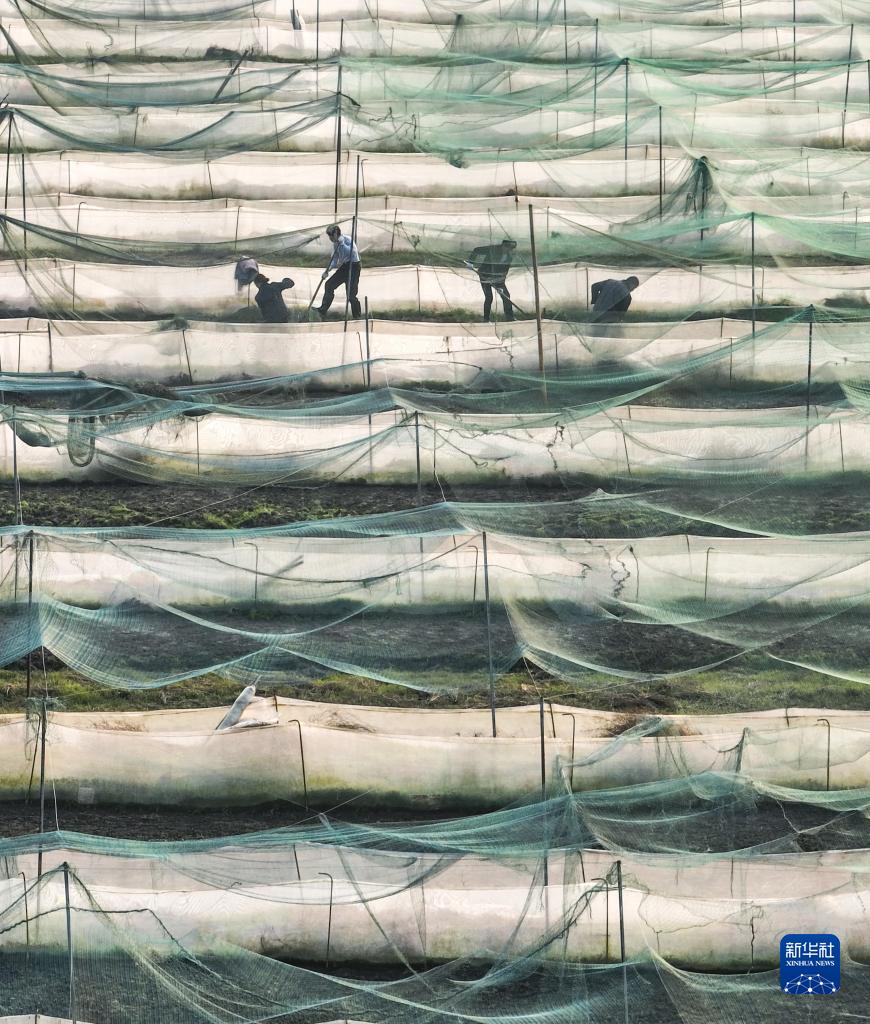 2月20日,在湖南省永州市道縣清塘鎮(zhèn)陳熊村稻蛙基地,村民在清理雜草(無人機照片)。