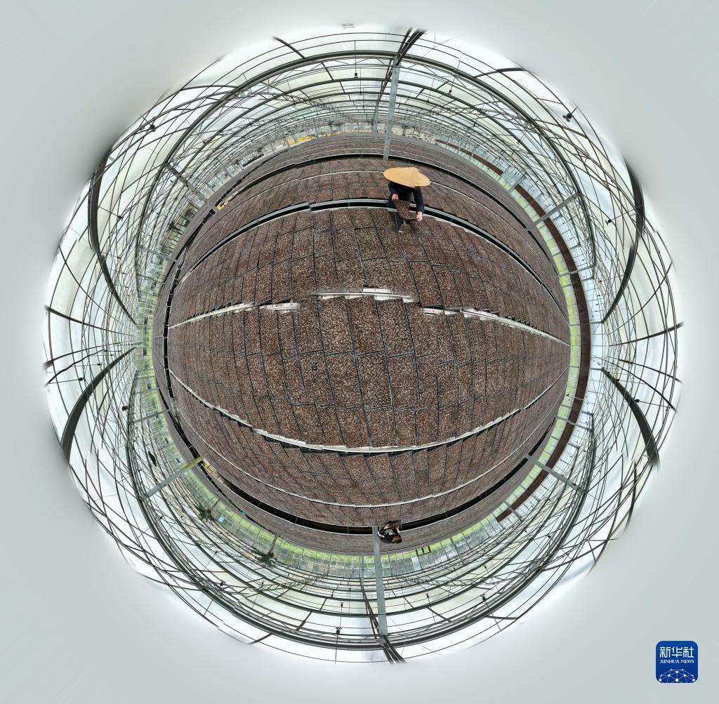 2月19日,村民在貴州省遵義市辣椒智慧產(chǎn)業(yè)園智能大棚擺放辣椒育苗穴盤(無人機全景照片)。