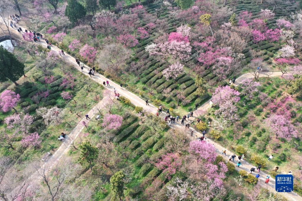 2月19日,人們在南京梅花山賞花游玩(無人機照片)。